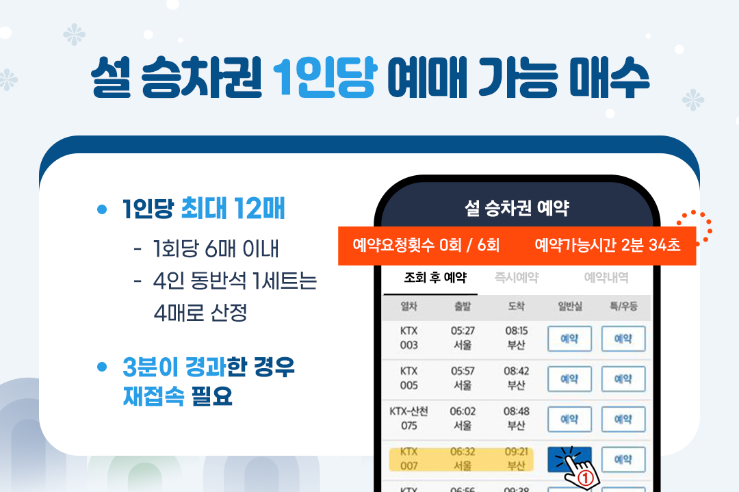 설 연휴 기차표는 한 사람이 1회당 6매, 총 12매 이내로만 예매가 가능해. 한 번 로그인하면 총 6번만 예매를 시도할 수 있지. 접속에 성공한 후 단 3분 내로 예매를 완료해야 하고, 시간이 초과되면 사이트에 다시 접속하게 되니까(대기번호부터 다시 받겠지? ㅠㅠ) 제한시간을 넘기지 않도록 주의해야 해!
