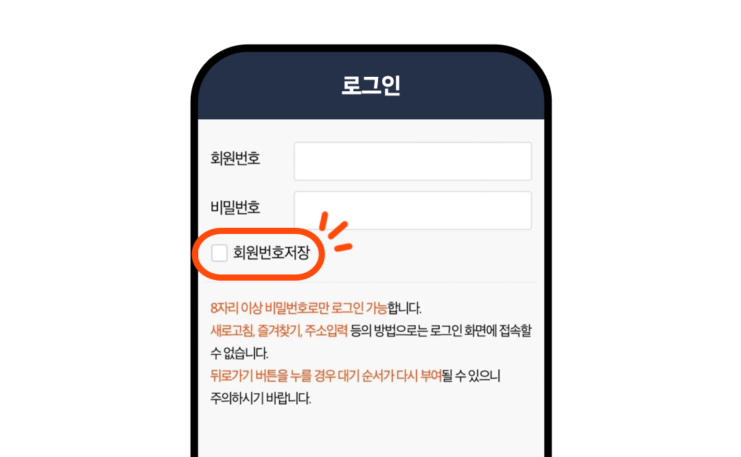 이런 불상사를 막기 위해 회원번호와 비밀번호를 자동저장 해 놓는 것도 하나의 꿀팁이야. 브라우저나 어플에서 계정정보 자동저장이 가능하거든. 본격 예매 전, 코레일 사이트에서 로그인을 미리 해 볼 때 ‘회원정보저장' 버튼을 꼭 체크해 두면 큰 도움이 될 거야!