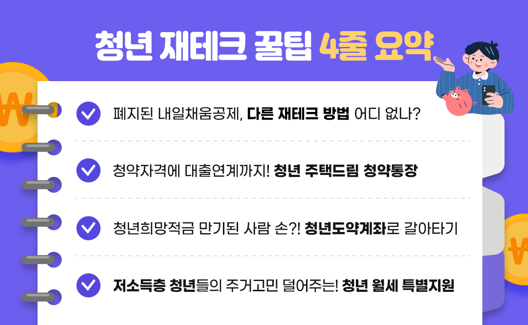 요즘은 월급 빼고 다 오른다는 말이 있잖아? 취업도 어렵고, 돈 벌기도 모으기도 참 어려운 요즘인데, 청년들의 어깨에서 짐을 덜어주는 다양한 상품들을 잘 활용해서 재테크를 해보는 건 어떨까? 세상의 모든 청년들이 경제적 자유를 누릴 때까지, 우리 모두 힘내서 파이팅해보자구🙌!