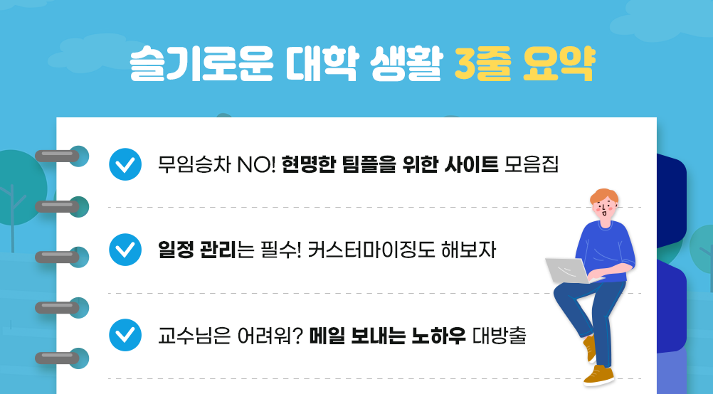 아마 대학생활 하면서 팀플 안 해 보는 사람은 없을 거야. 여러 사람들이 모여 하나의 결과물을 내야 하는 만큼 고등학교 때까지 혼자 공부하면 되던 것과는 다르다 보니, 유독 팀플에서 어려움을 호소하는 대학생들이 많은 것 같아. 하지만 이제 걱정은 NO! 팀플할 때 유용한 사이트들을 알려줄게.