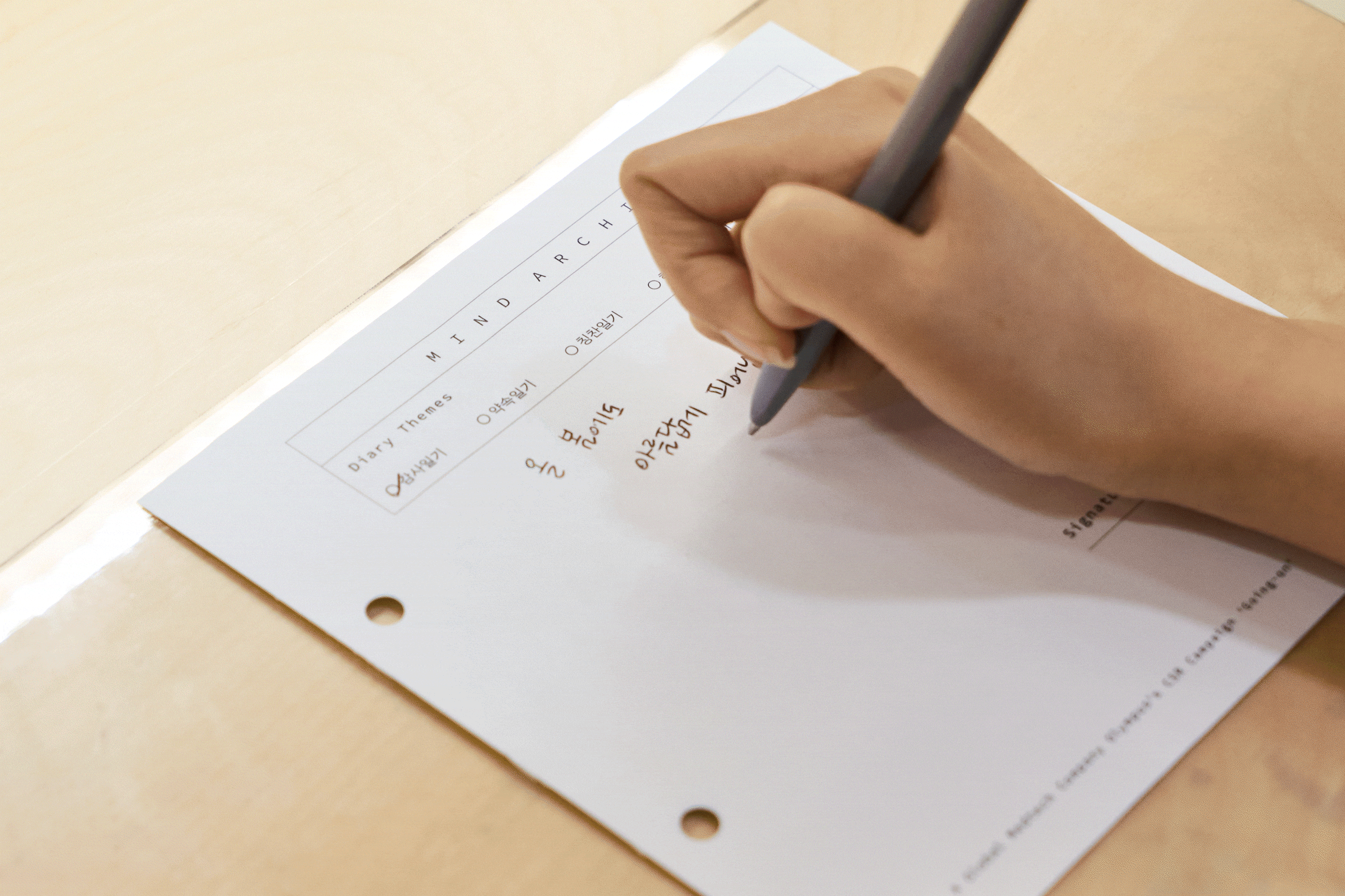 암 경험자들의 일기를 읽다 보니 오늘의 나를 기록해 보고 싶은 마음이 물씬 들지 않아? 그런 사람들을 위해 <마음기록관>에는 일기를 직접 써볼 수 있는 공간이 마련되어 있지.