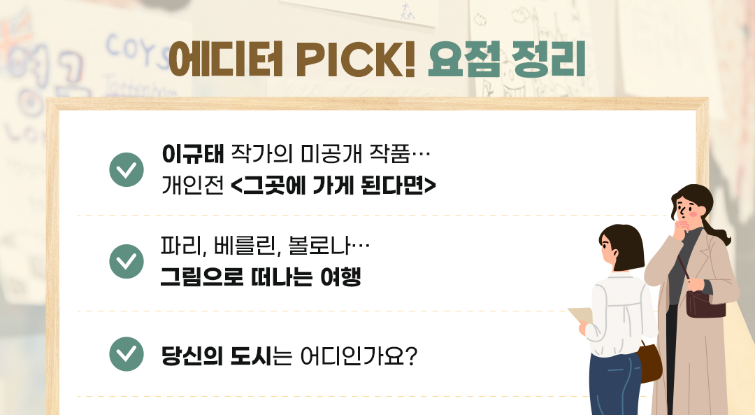그림으로 떠나본 여행, 어땠어? 비록 상상 속 여행이었지만, 낯선 도시로 떠나는 기분 좋은 설렘이 느껴지지 않았어? 이규태 작가 개인전 <그곳에 가게 된다면>은 오는 6월 30일까지 진행될 예정이니 교보아트스페이스에 꼭 방문해서 그 설렘을 직접 느껴보길 바랄게!
