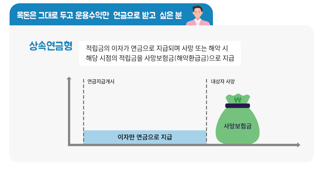 <상속연금형>은 적립금에서 발생되는 이자만 연금으로 지급하고 가입자가 사망하거나 해약하는 경우 해당 시점의 적립금을 지급하는 방식입니다. 특히 가입자가 사망하는 경우 적립금을 사망보험금으로 가입자의 상속인에게 지급해요.