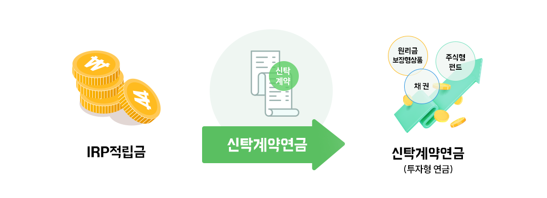 기존 IRP계좌와 동일하게 여러가지 방식으로 적립금을 투자해 증액할 수 있으면서도 목돈이 필요한 시점에 원하는 금액을 수령할 수 있도록 유연성을 갖출 수 있는 방법이죠.
