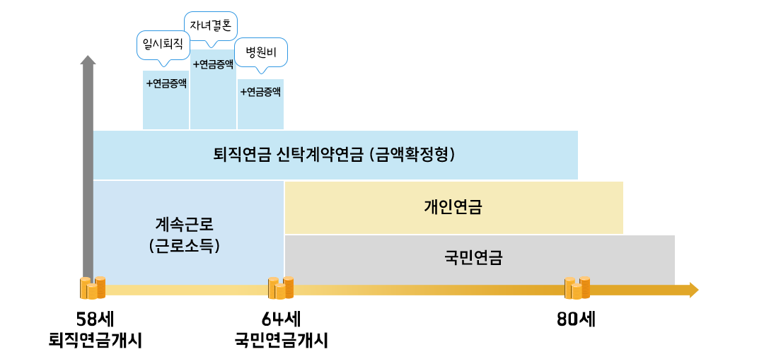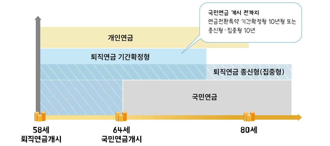 소득공백기간에 해당 연금을 수령해 생활자금을 충당하고 국민연금 개시 시점 이후에는 국민연금을 기본으로 남은 퇴직연금을 보충하는 방법입니다.