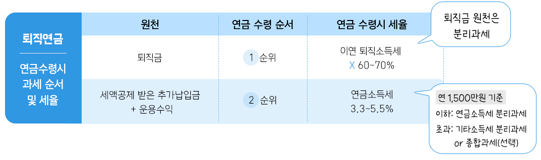 퇴직연금을 수령할 때는 퇴직금 원천에서 먼저 금액이 차감된 다음 추가납입분과 운용수익에서 연금을 수령하게 되는데요. 후자의 경우 연 1,500만원 이하여야 연금소득세로 분리과세가 가능하다는 점을 꼭 기억해야 합니다. 연 1,500만원을 넘는 경우 종합소득세 납부대상이 되므로 세금이 늘어나게 될 가능성이 높아요.