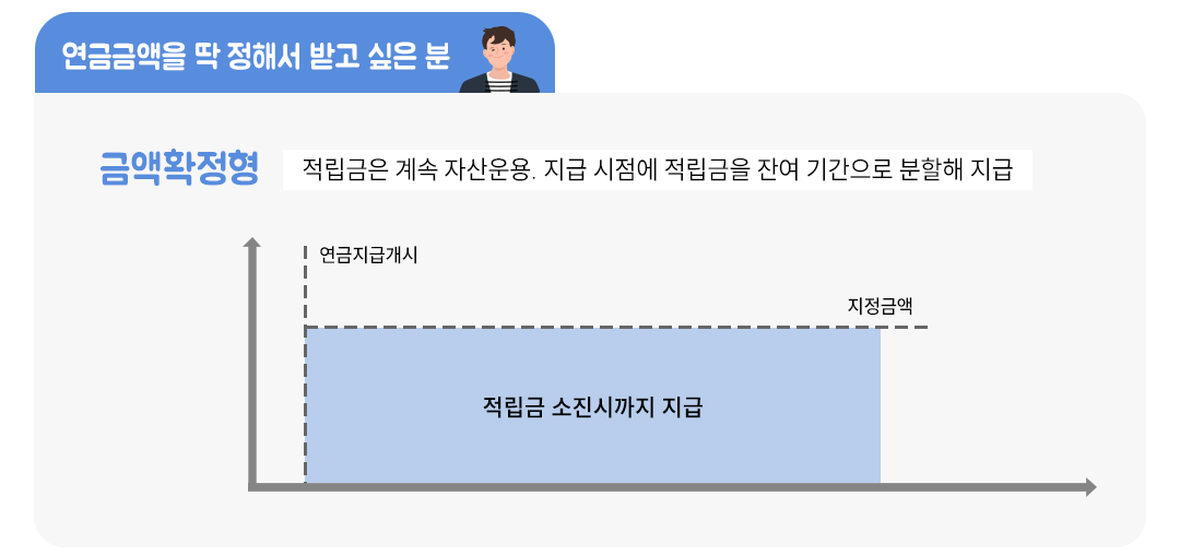 <금액확정형>은 연금액을 지정하면 가입자가 지정한 지급 날짜에 신청한 금액의 연금을 지급하는 방식입니다. 지급 기간은 적립금이 소진될 때까지 계속 이어지는 방식이죠. 가입자가 적립금을 적절하게 투자해 수익을 낸다면 연금 소진 기간을 늦출 수 있습니다.