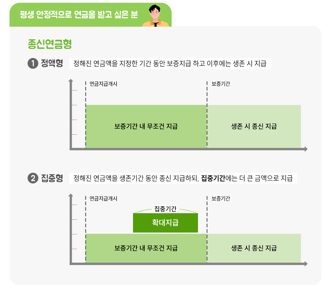 <종신연금형>은 가입자가 사망할 때까지 지급되는 연금으로 '정액형'과 '집중형'으로 나뉘어요.