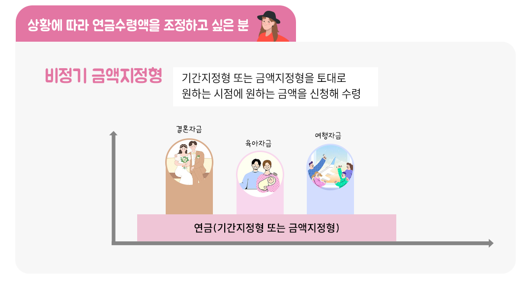 <비정기금액지정형>은 <기간지정형>이나 <금액지정형>을 기본으로 설정한 후 원하는 시점에 원하는 연금액을 신청해 수령하는 방식입니다. 당장 연금을 받지 않더라도 생활비에 문제가 없는 경우, 금액을 소액으로 지정하여 수령하다 목돈이 필요할 때 증액 신청을 해서 큰 금액을 수령할 수 있죠. 연금이 필요한 시기가 되면 연금 수령액을 늘일 수도 있어 자금흐름 관리에 유용하게 활용할 수 있습니다.