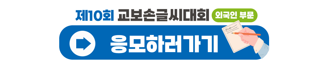 제10회 교보손글씨대회 외국인 부문은 지난 7월 11일부터 응모를 받기 시작했어. 그렇다고 너무 조바심 낼 필요는 없다구! 응모는 9월 1일까지 가능하니까 천천히 자신이 좋아하는 문장이나 K-POP 가사를 생각해 보고 한국어로 정성스럽게 손글씨 써 보자구!