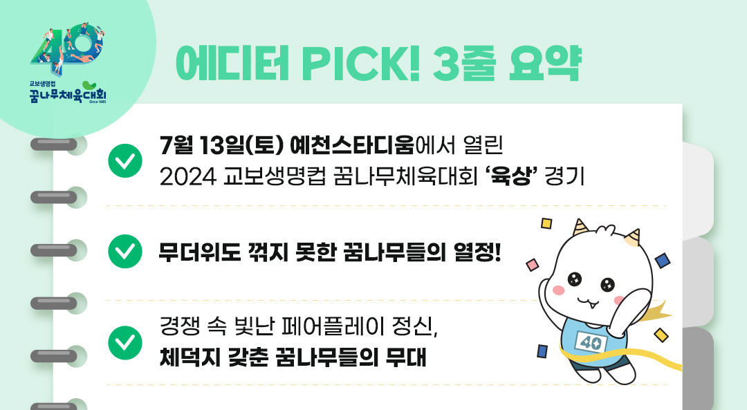 오늘의 문제! 민간에서 개최하는 최초이자 유일한 유소년 종합 체육대회는 뭘까? 힌트는 교보생명 블로그에서 이 대회의 40년 역사를 한눈에 볼 수 있었던 사진전과 귀여운 굿즈를 살 수 있는 팝업 스토어를 소개한 바 있어.