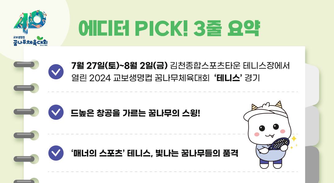 마지막 꾸미 인형을 뽑은 행운의 주인공은 우레와 같은 박수와 환호를 받았지. 사실 테니스 경기는 일정상 2024 교보생명컵 꿈나무체육대회의 마지막 종목이었는데, 쉽지만은 않았을 꿈나무들의 대장정이 유쾌하고 행복한 기억으로 마무리된 것 같아서 기뻐!