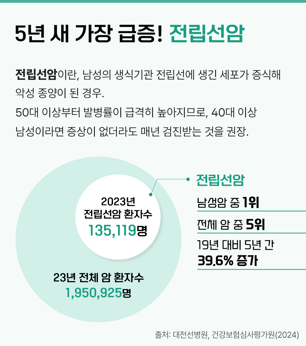 건강보험심사평가원에 따르면, 2023년 우리나라 전체 암 환자수는 195만 925명입니다. 이 중 전립선암 환자수는 13만 5,119명을 기록했는데요. 이렇게만 봐서는 전립선암의 비중이 적은 것 같지만, 남성에게 발병하는 암(남성암) 중에 무려 발병률 1위인 암입니다.