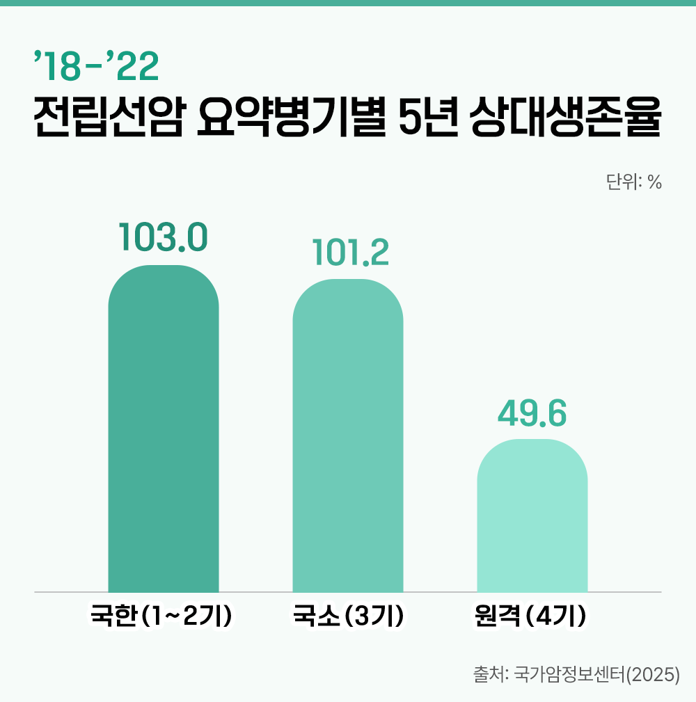 전립선암도 병기에 따라 생존율이 달라지는데요. 장기(전립선)를 벗어나지 않은 1~2기(국한)의 경우 5년 상대생존율이 103.0%로 높고, 암이 발생한 장기 외 주위 장기, 인접 조직 또는 림프절을 침범한 3기(국소진행) 또한 5년 상대생존율이 101.2%에 이릅니다. (출처: 국가암정보센터(2025)).
