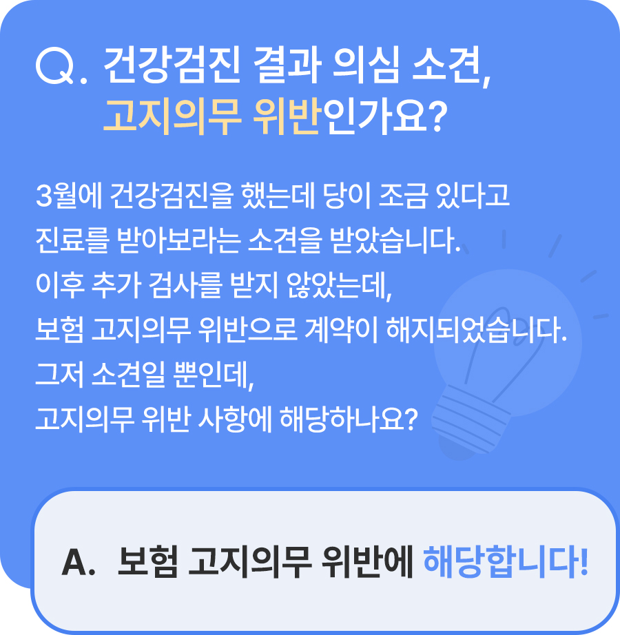 질문자의 경우 ‘건강검진 시 받은 의심 소견’이 보험 고지의무 위반에 해당하는지를 물어보셨는데요. 결론부터 말씀드리면, 이는 고지의무 위반에 해당합니다!