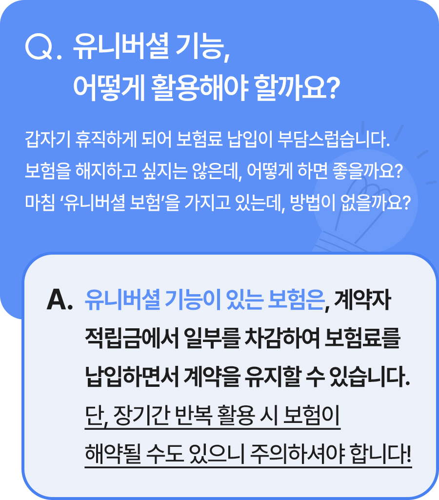 보험은 미래의 우연한 사고나 역경에 대비하기 위해 가입하는 금융 상품입니다. 따라서 유니버셜 보험의 중도인출 기능을 활용할 때에는 아래 내용을 참고하세요.