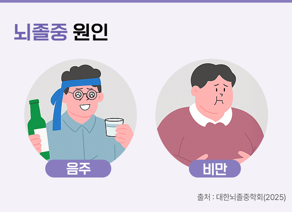 이 밖에도 흡연, 음주, 비만 등도 뇌졸중을 일으키는 원인으로 꼽히고 있습니다. (출처: 대한뇌졸중학회, 2025)