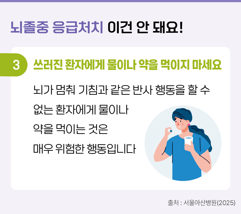 쓰러진 환자에게 물이나 약을 먹이는 경우도 있는데요. 뇌가 멈춰 기침과 같은 반사 행동을 할 수 없는 환자에게 이와 같은 행동은 매우 위험하니 주의가 필요합니다! (출처: 서울아산병원, 2025)