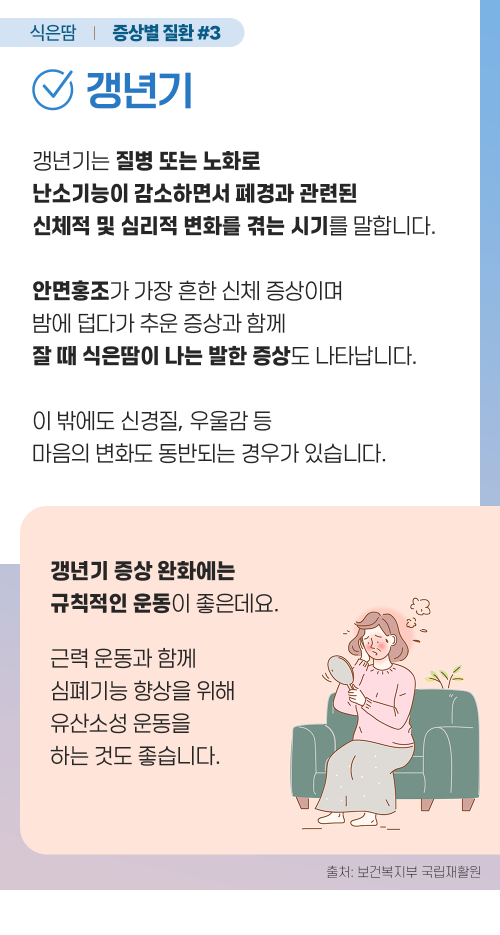 안면홍조가 가장 흔한 신체 증상이며 밤에 덥다가 추운 증상과 함께