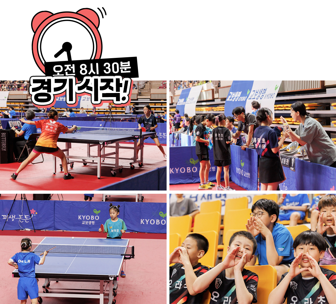 탁구에 대한 기본적인 정보를 알아보았으니 이제 본격적으로 개회식과 꿈나무들의 경기 현장을 만나볼까요? 교보생명이 찾은 7월 29일에는 여자부 6학년 예선과 본선 토너먼트 32강, 3~4학년 본선 토너먼트 32강, 1-2학년부 본선 리그와 단체전 16강이 열렸습니다. 또한 남자부 단체전 32강, 16강도 함께 진행됐습니다.