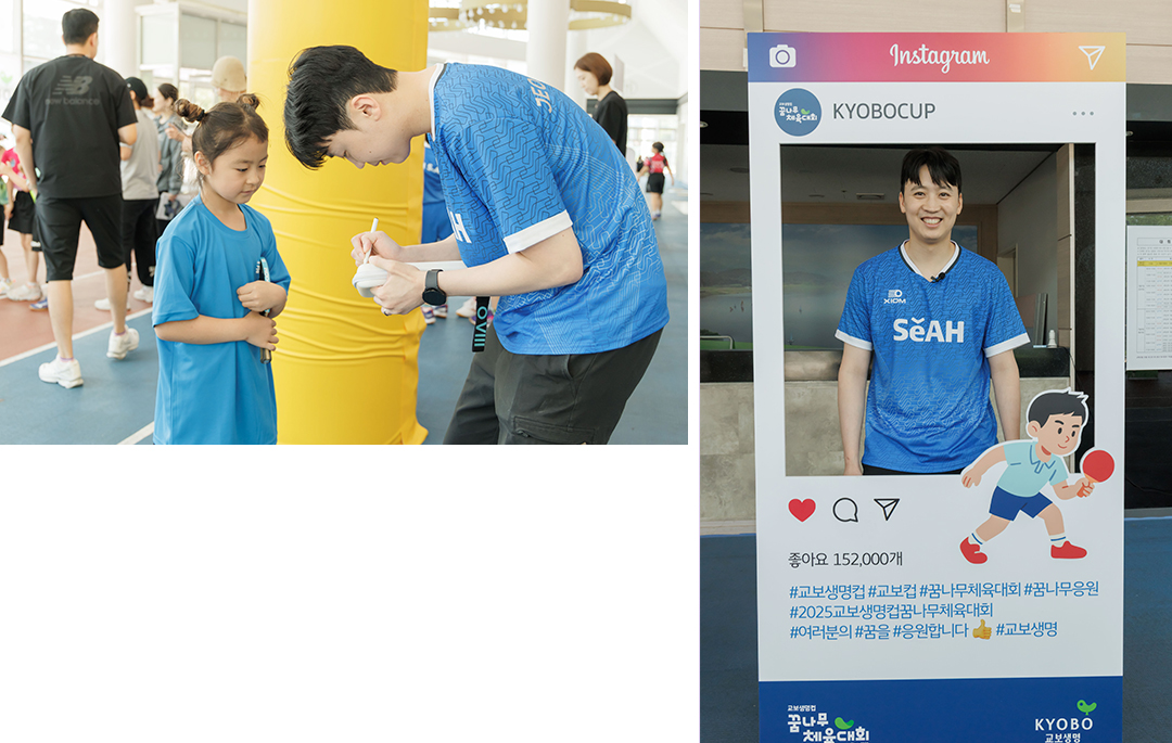 개회식이 끝난 직후, 또 한 번의 깜짝이벤트가 진행되었는데요. 바로 정영식 감독의 사인회였습니다. 정영식 감독님은 교보생명컵 꿈나무체육대회의 출신이자 세아탁구단의 초대 감독이시죠! 최근까지 탁구 국가대표로 활약하며 2018 자카르타-팔렘방 아시안게임 단체전 은메달과 2010 모스크바 세계선수권대회 단체전 동메달 등 수많은 국제대회 메달을 거머쥐었으며, 다양한 방송 프로그램에도 출연해 탁구의 대중화를 이끌고 있습니다.