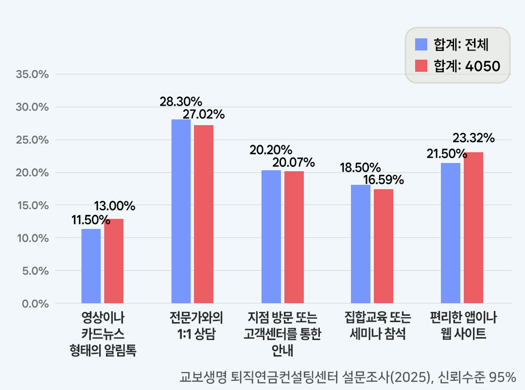 은퇴설계 서비스에 대한 접근 방식에 대한 설문 결과 전체 응답자의 28.3%, 4050세대의 27.02%가 ‘전문가와의 1:1 상담’을 가장 선호했습니다. 은퇴 설계는 단순한 정보 전달보다 개인 상황을 반영한 맞춤형 조언이 중요하다는 점을 보여주는 결과입니다.