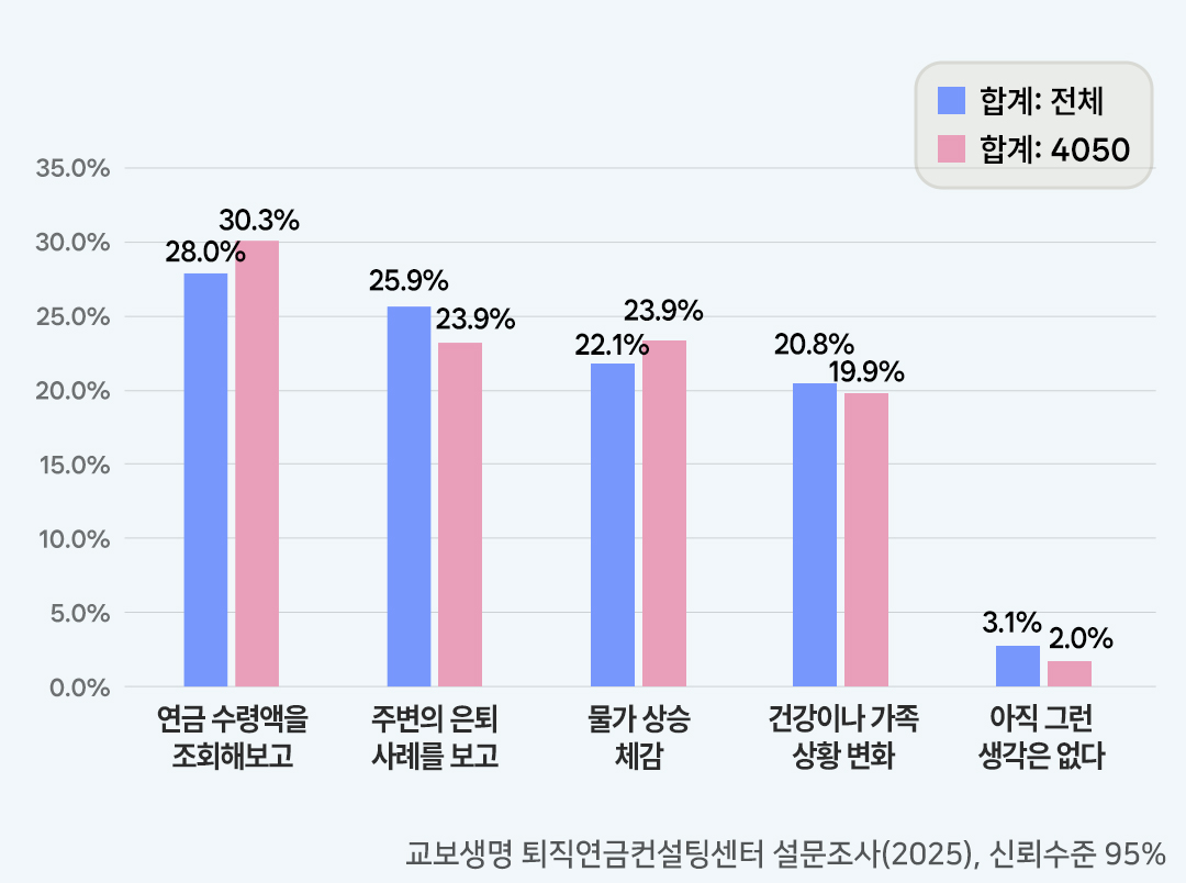 그 밖의 이유로는 ‘주변의 은퇴 사례를 보고’(전체 25.9%, 4050세대 23.9%), ‘물가 상승 체감’(전체 22.1%, 4050세대 23.95%), ‘건강이나 가족 상황 변화’(전체 20.8%, 4050세대 19.9%) 순으로 많았습니다. 반면 ‘아직 그런 생각을 해본 적 없다’는 응답은 극히 낮았죠(전체 3.1%, 4050세대 2.0%).