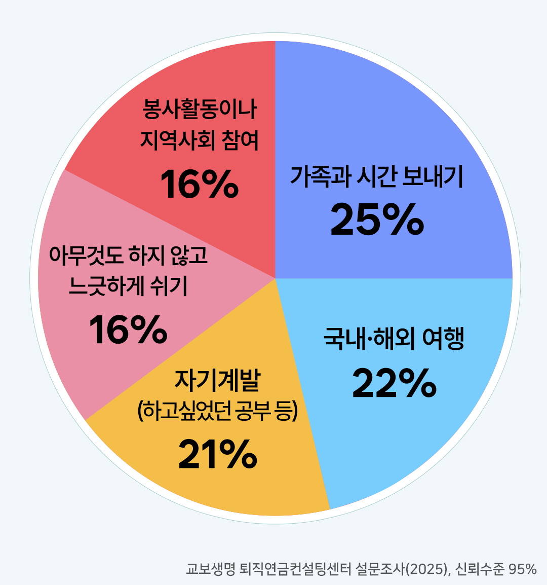은퇴 후 가장 먼저 하고 싶은 일에 대한 설문 결과를 보면, 대부분의 사람들은 은퇴 후 가족과 시간을 보내거나(25%), 국내·해외 여행(22%), 하고 싶었던 공부나 취미 같은 자기계발(21%)을 계획하는 등 여유로운 생활을 꿈꾸고 있습니다.