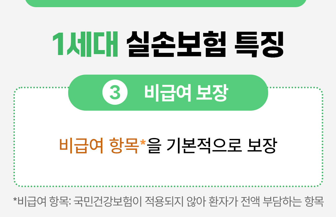 비급여 항목을 보장한다는 것도 1세대 실손보험의 강점 중 하나인데요. 비급여 항목이란 국민건강보험이 적용되지 않아 환자가 의료비 전액을 부담해야 하는 항목을 말합니다. 1세대 실손보험은 이와 같은 비급여 항목을 보장하기 때문에 혜택이 많죠.