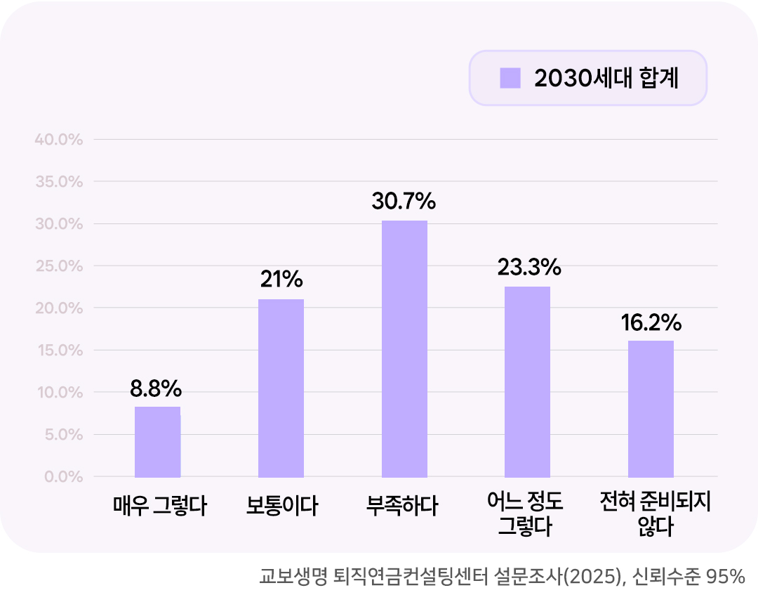 2030세대는 은퇴 준비를 어느 정도 수준으로, 어떻게 하고 있을까요? 사회초년생 상당수가 은퇴 준비를 이미 시작했지만, “아직 준비가 부족하다”는 응답이 많았습니다.