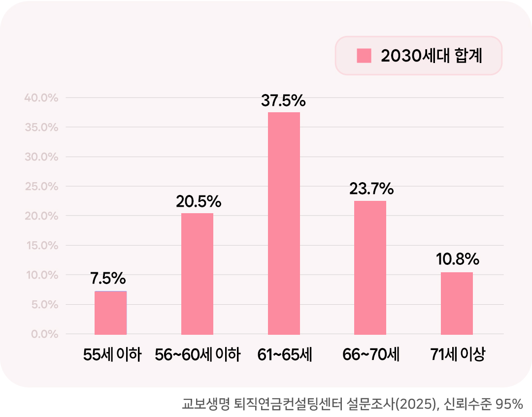 그렇다면, 2030세대는 은퇴 시점을 언제로 예상할까요? 전체 응답 중 61~65세(37.5%)가 가장 많았고, 이어서 66~70세(23.7%), 56~60세(20.5%) 순으로 나타났습니다. 71세 이상을 꼽은 이들도 10.8%나 됐는데, 이는 기대수명 연장과 노후 생활비 부족에 대한 우려가 반영된 결과로 보입니다.