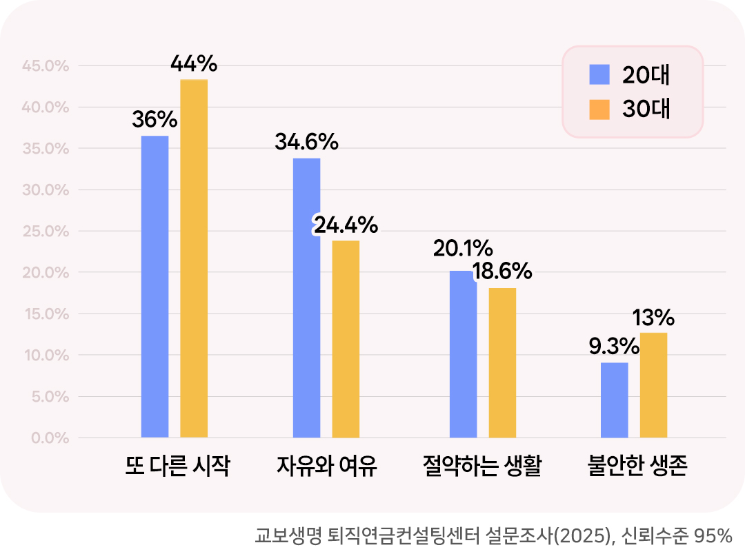 2030세대 안에서도 은퇴에 대한 인식 차이는 연령대별로 뚜렷했는데요. 20대는 은퇴를 비교적 낙관적이고 추상적으로 인식하는 반면, 30대는 현실적이고 구체적인 불안을 더 많이 느끼고 있었습니다.