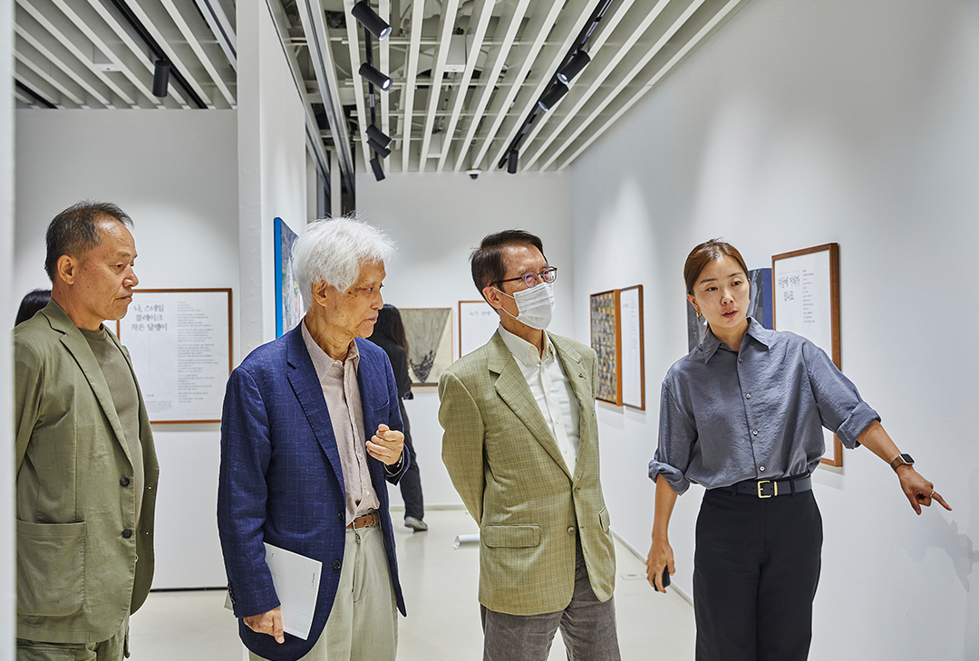 이번 개막식은 전시에 참여한 작가들이 신창재 의장과 함께 전시회장을 둘러보는 것으로 마무리되었습니다. 작가들은 자신이 그린 그림에 대한 설명의 시간을 가졌는데요.