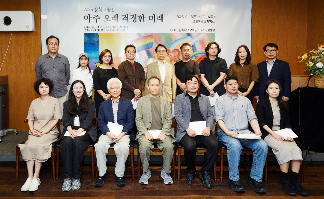 지난 24일 교보문고 광화문점 배움홀에서는 <아주 오래 걱정한 미래> 문학그림전의 개막식이 열렸습니다. 이 자리에는 교보생명 대표이사이자 대산문화재단 이사장인 신창재 의장은 물론, <아주 오래 걱정한 미래> 전시에 참여한 시인과 화가들이 참석해 자리를 빛냈습니다.