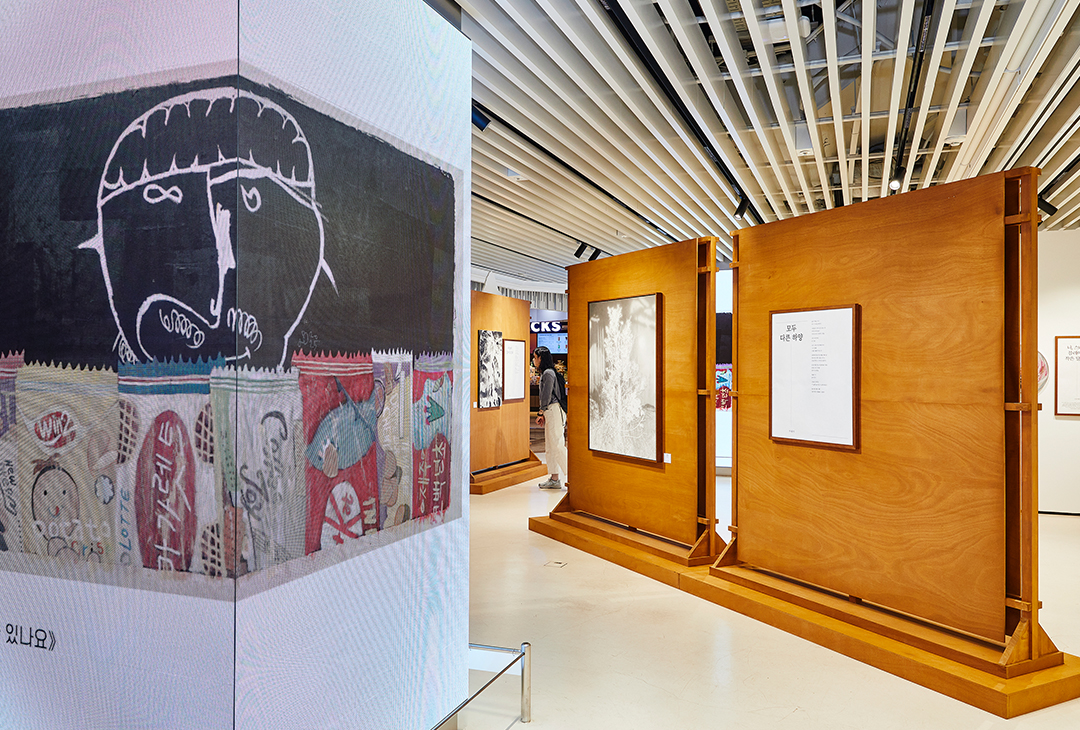 특히 이번 전시는 지금까지 교보아트스페이스에서 진행했던 문학그림전과는 조금 다르다고 하는데요. 지금까지의 문학그림전이 텍스트(시)보다는 그림에 초점을 맞춰 전시를 구성했다면, 이번 <아주 오래 걱정한 미래>는 그림과 텍스트를 같은 위치에서 감상할 수 있습니다.