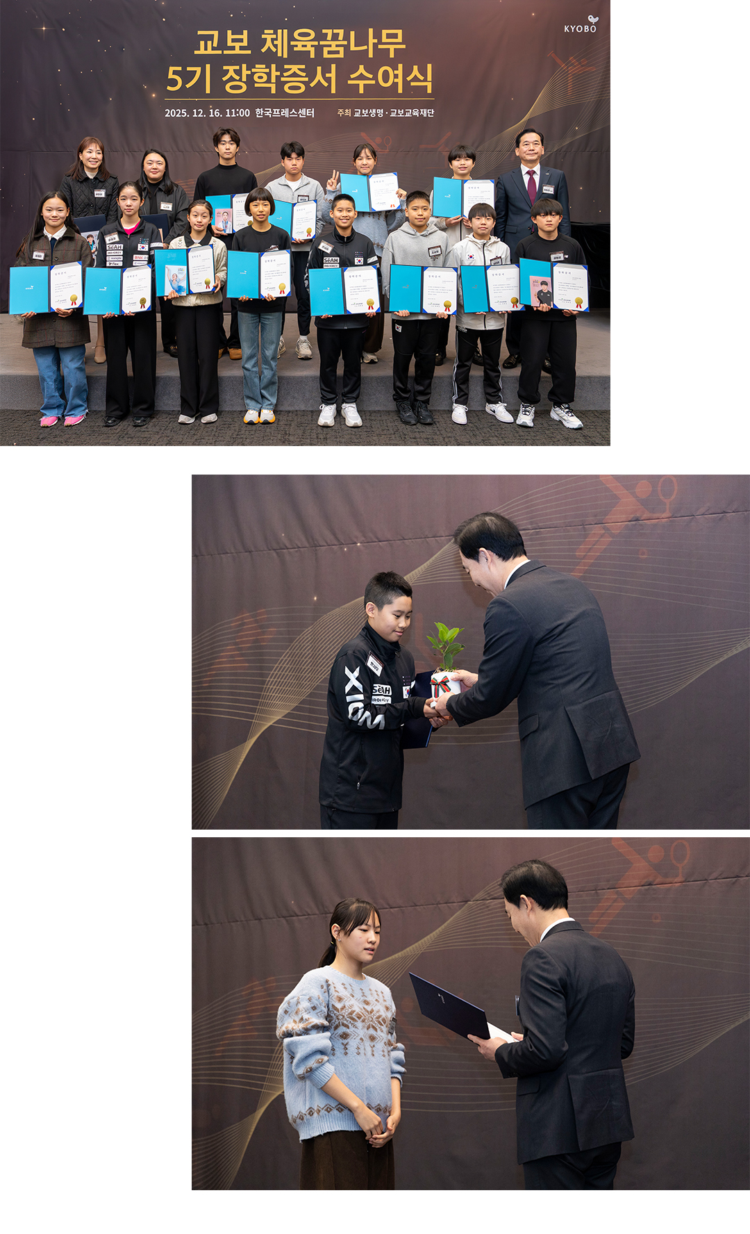 또 “다른 대회였다면 아마 경기 기록만 봤겠지만, 교보생명컵 꿈나무체육대회는 그런 취지가 아니다”라며 “장차 우리나라 스포츠계를 이끌 엘리트가 될 장학생들이기 때문에 실력과 인성 등 다양한 부분을 검토해야 했다”고 강조했습니다.