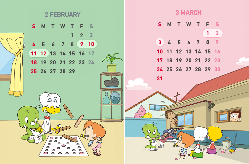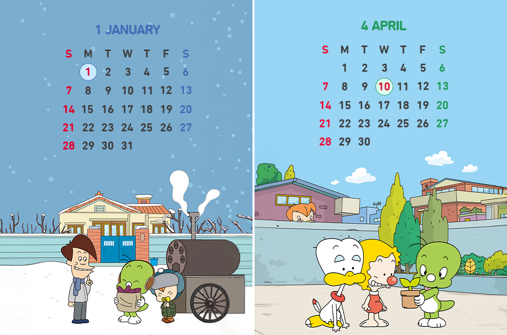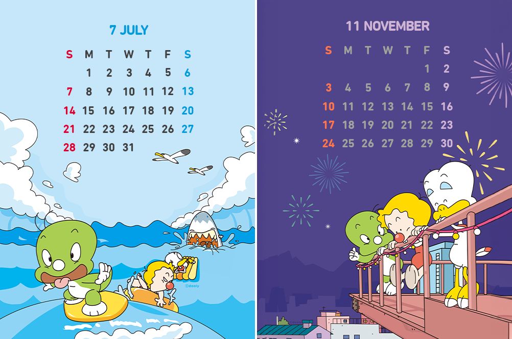 아, 참! 교봉이와 함께 내년 공휴일을 알아보면서 달력에 눈길이 간 친구들도 많을 것 같아👀. 그 맘 충분히 이해해. 귀여운 아기 공룡 둘리와 그 친구들이 달력에 있으니, 눈길이 갈 수밖에 없지😆! 귀여운 둘리 모바일 달력은 교보생명 디지털 패키지에서 다운 받을 수 있어. 달력뿐만 아니라 디지털 스케줄러도 준비되어 있다구🙌!